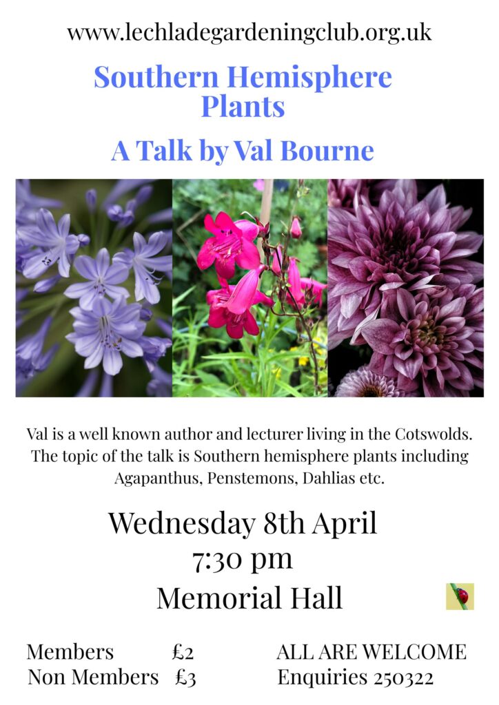 Val Bourne , a well known author and lecturer is coming to give us a talk on Southern Hemisphere plants.  It promises to be a really interesting talk .